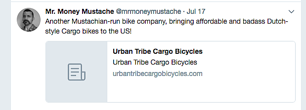 For Powell, who now has two young children, cargo bikes suit his family's Mr. Money Mustache-inspired life. And the e-commerce business, which allows flexibility and autonomy, also fits the philosophy. Even the company name was inspired by a 2015 Mr. Money Mustache blog posting, Get Rich With Your Own Urban Tribe.
