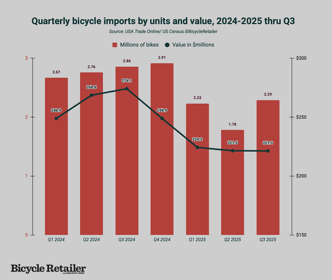 Through the first three quarters, the U.S. imported 6.3 million bikes, down from 8.3 million over the same period last year. The import value was $667 million, down from $792 million.