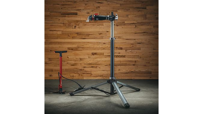 Feedback Sports' new Pro Air Lift workstand, which won a Eurobike Design Award this year, can be pressurized with a floor pump or air compressor to lift bikes weighing up to 100 pounds. That means it can be used in remote locations with no electricity available. To match the workstand, Feedback also is releasing its first pump, the Pneumo CC Floor Pump, which has a concealed internal air cannister that can be pressurized to deliver a burst of air for tire seating or to power the Pro Air Lift. The Pro Air Lift will retail for $725 and the pump will retail for $150. Feedback also is launching two new tool trays for its workstands at Eurobike this year.