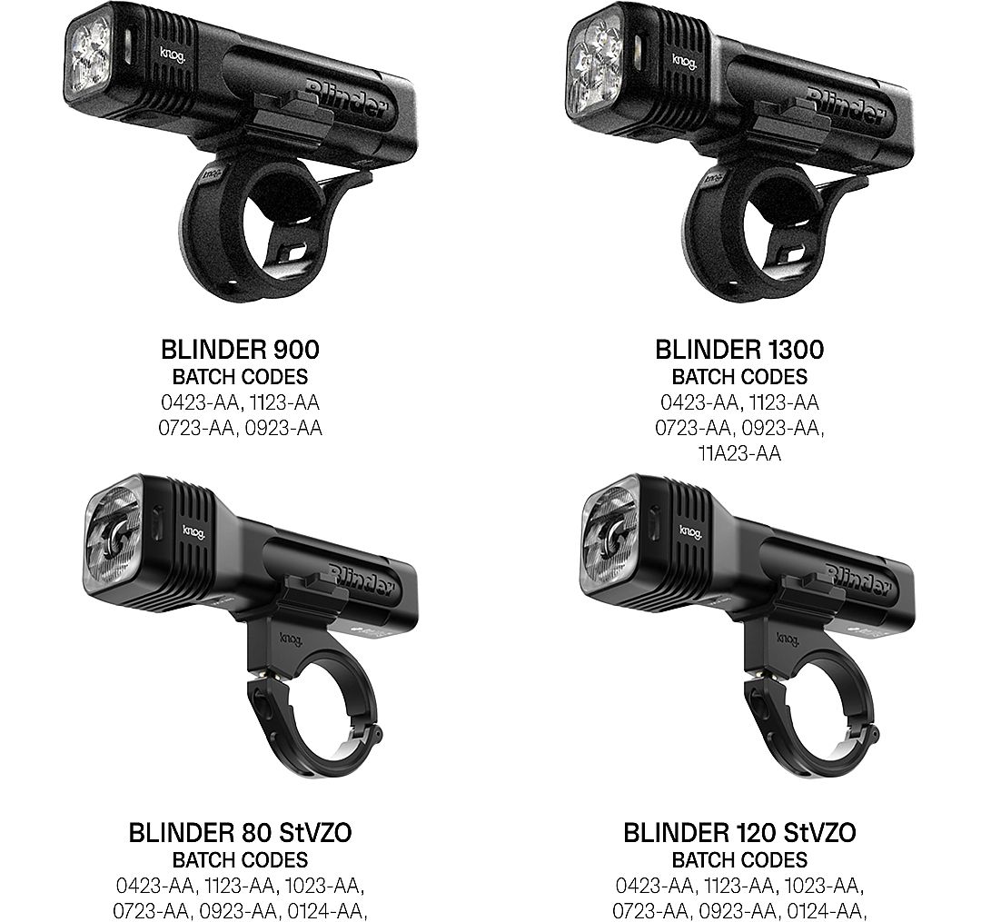 The recalled models are the Blinder 900, Blinder 1300, Blinder 80 StVZO, Blinder 120 StVZO with batch numbers: 0423-AA, 0723-AA, 0923-AA, 1023-AA, 1123-AA, 11A23-AA & 0124-AA. Each light has the batch code on the base of the product.