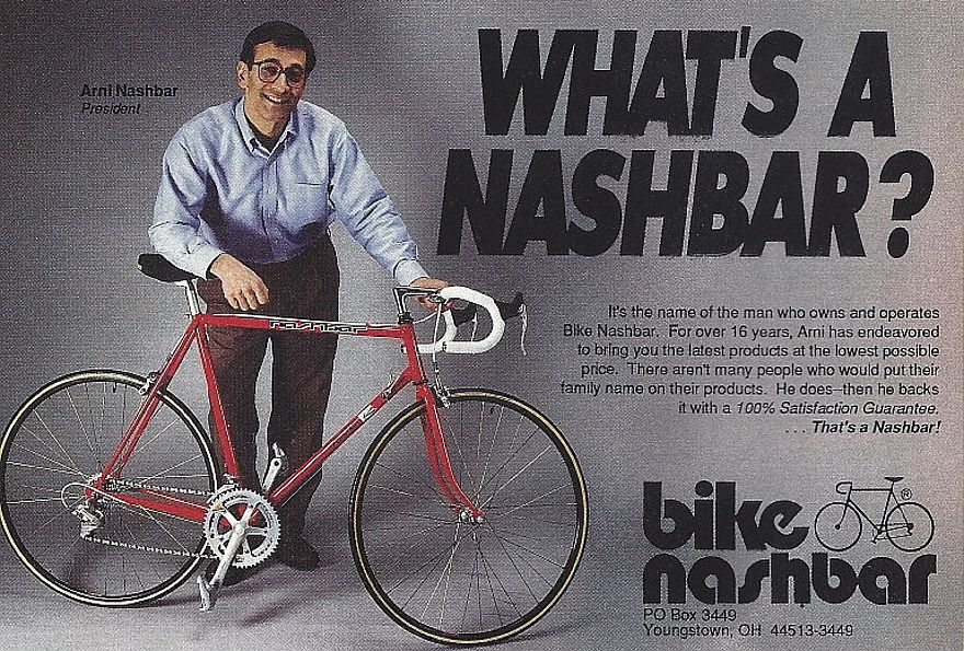 Nashbar, a Ohio native, had a background in advertising and design and paid his way through college airbrushing custom cars on sweatshirts and t-shirts at county fairs and car shows. He studied at the Cleveland Institute of Art and Youngstown State University before leaving college in 1963 to take his dream job as a designer at The Edward J. Bartolo Corporation, a retail development company.