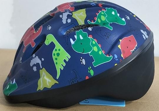 OM-TD BIKE is blue with a dinosaur print, black padding, black straps, black buckle, and a black plastic knob at the back for fitment adjustment. It was sold in children's size small. "OM-TD BIKE" and "05/2024" (the manufacture date) is printed on a label inside, and the brand is printed on the back of the helmet.