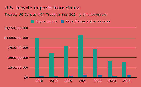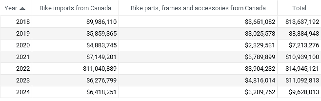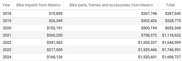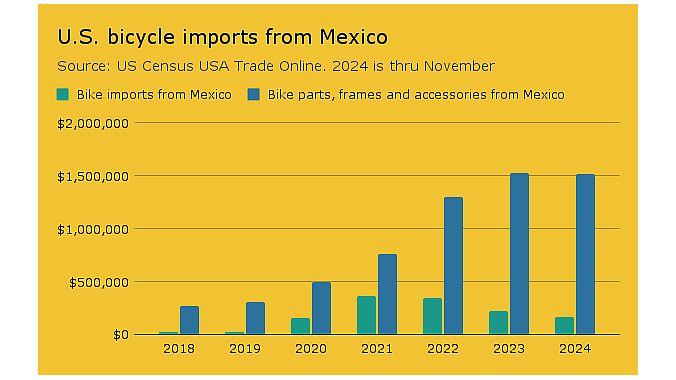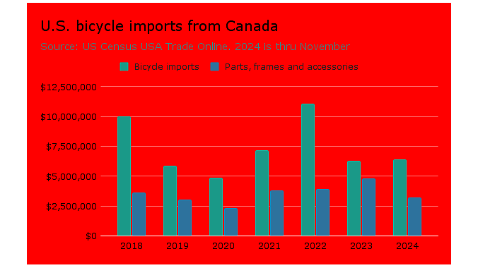 Meanwhile back in North America, the industry imported just $1.7 million in bicycles and bike parts from Mexico in the first 11 months last year, and less than $10 million from Canada over the same period. The figures do not include e-bikes and softgoods including cycling apparel, shoes and helmets. For comparison, by the same measures the U.S. imported $446 million in bike goods from China in the first 11 months.