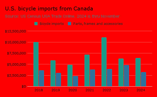 Brands in some industries operate distribution centers in Canada that take advantage of the de minimis loophole to ship sub-$800 packages of Chinese products directly to U.S. consumers. To what extent that is happening in the bike industry is unknown. The loophole for Canadian and Mexican products remains open another 30 days.