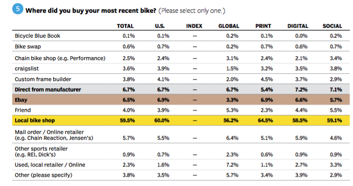 Nearly 60 percent of the respondents bought their last bike at a local bike shop. The next most common place to buy a bike was direct from the manufacturer, but that was a distant second place at 6.7 percent. eBay was the third most common source at 6.5 percent. Other sources included from an online or mail order company (5.7%), from a custom builder (3.8%), Craigslist (3.6%) or a chain bike shop like Performance (2.5%).