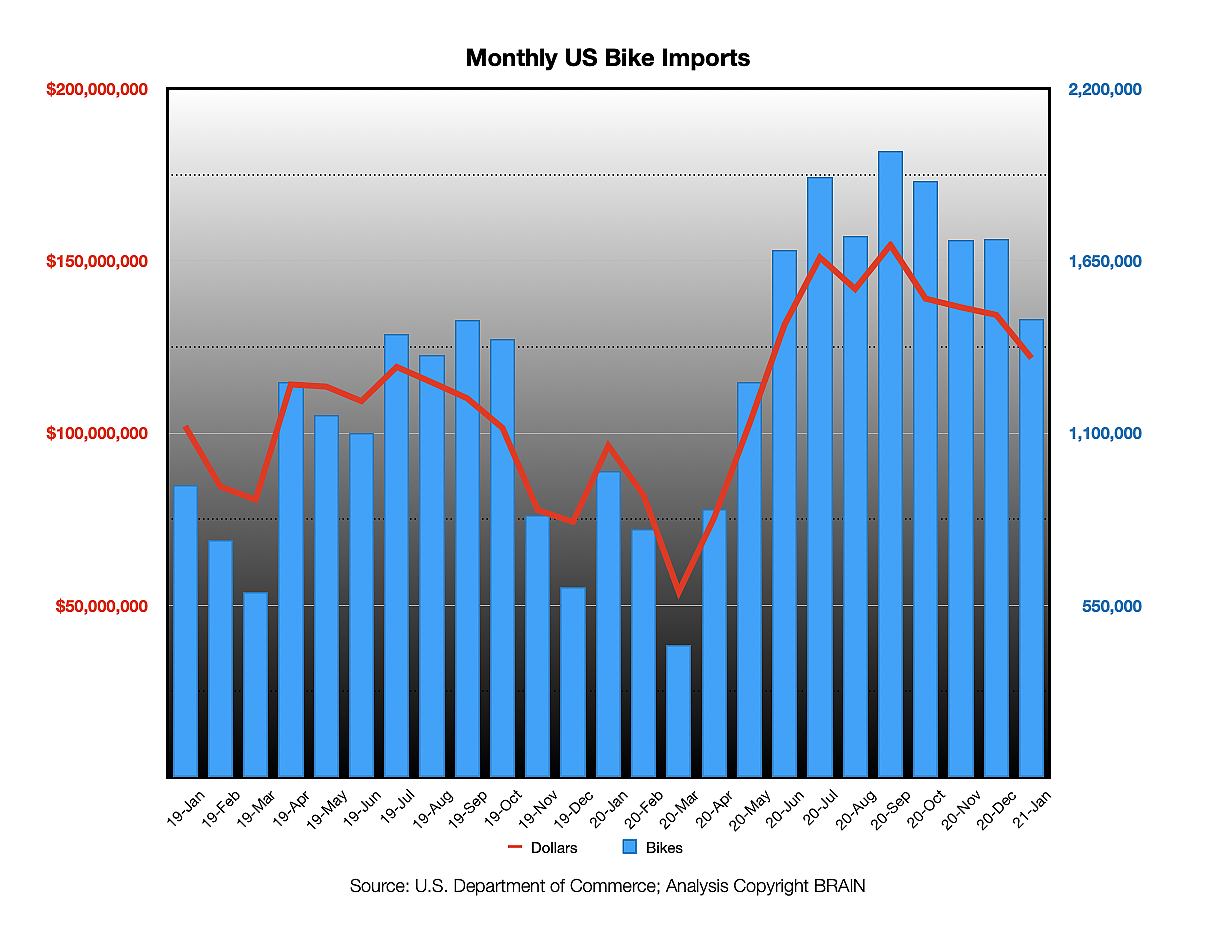 The import figures from the Department of Commerce, released Friday, include all bikes imported except e-bikes. The January import numbers were the smallest since last May; imports may have declined from late 2020 because a 25% tariff on China-made bikes was re-imposed on Jan. 1 so importers made extra efforts to try to get bikes onshore before that deadline.