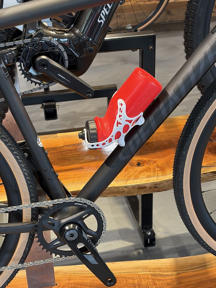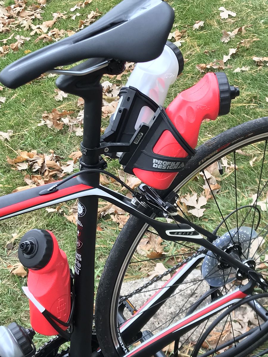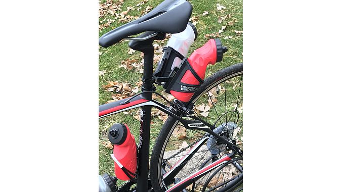 The cage fits standard frame mount positions (not side-load). The cage is compatible with traditional round bottle cages for mixed training setups.