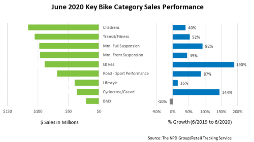The growth in children's, lifestyle, and transit/fitness bikes slowed compared to their April and May 2020 rates, likely as a result of lowered inventories at retail, NPD said.. Although June growth for these categories was lower than that of the performance categories, they showed significant average sales price increases. June average selling prices were up 20% compared to the same period last year for lifestyle bikes, +33% for transit/fitness, and +13% children's bikes.