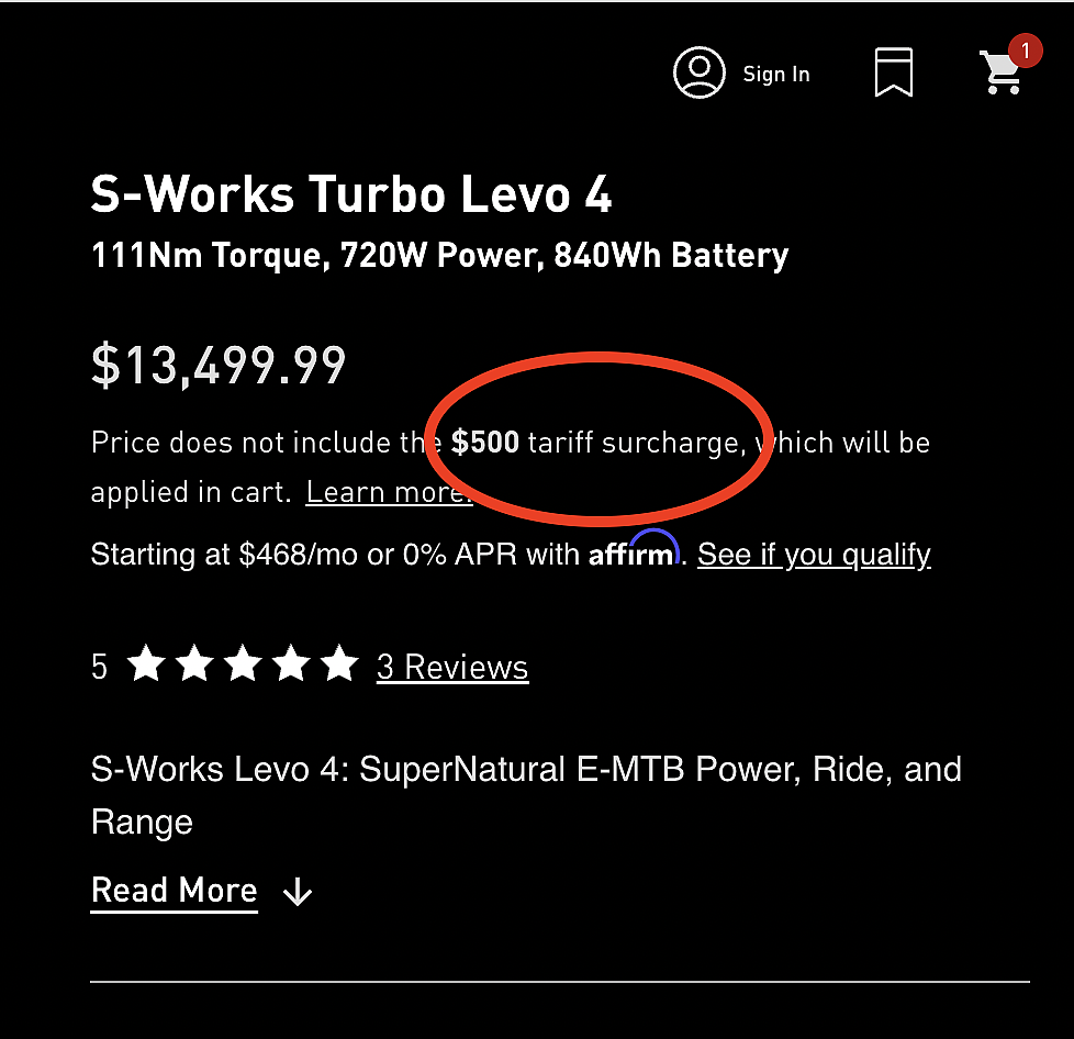 Specialized, for example, said it would add a 10% tariff surcharge to dealer invoices and D2C shopping carts on some e-bike models on May 1, and said it would adjust other prices by varying amounts. The company declined to talk to BRAIN about its policy. Its website currently shows $300 and $500 flat tariff surcharges on some Turbo Levo models, but doesn't show surcharges on other models.