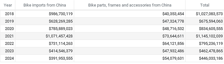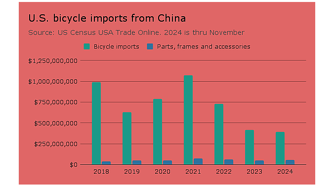 Meanwhile back in North America, the industry imported just $1.7 million in bicycles and bike parts from Mexico in the first 11 months last year, and less than $10 million from Canada over the same period. The figures do not include e-bikes and softgoods including cycling apparel, shoes and helmets. For comparison, by the same measures the U.S. imported $446 million in bike goods from China in the first 11 months.